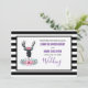 Um convite de casamento com uma cabeça de veado preto com grandes chifres. Linhas geométricas dentro do rosto do veado adicionam um toque único. Flores cor-de-rosa coloridas e folhas verde-menta formam uma coroa na sua cabeça e um buquê floral abaixo do seu pescoço. Sensação rústica country.