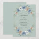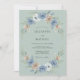Delicadas flores azuis e rosadas se entrelaçam com folhas verdejantes, criando uma elegante grinalda floral. Este design evoca um clima suave e romântico com sua paleta de cores suaves. A arte sugere uma atmosfera sofisticada e terna para uma ocasião especial.
