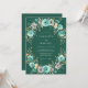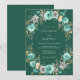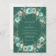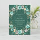 Uma cascata de luxuriantes flores de teal, acentuadas com folhagens suaves cinza e douradas, cria uma atmosfera elegante e romântica. Este design evoca um sentido de beleza natural e charme refinado. O fundo rico e verde escuro realça o arranjo floral vibrante, perfeito para uma celebração sofisticada.