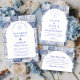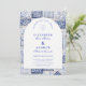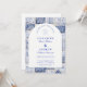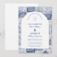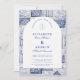 Um design atemporal em azul e branco inspirado na porcelana clássica de Delft e nos padrões toile franceses. A borda de azulejos em patchwork combina flores delicadas, listras e motivos ornamentais que evocam cerâmicas europeias vintage. Um painel arqueado suave no centro mantém o layout refinado e elegante, ao mesmo tempo que permite que os detalhes do padrão inspirado em porcelana emoldurem a celebração de forma linda. Perfeito para casais que planejam um casamento sofisticado em azul e branco com charme europeu tradicional.