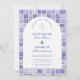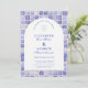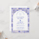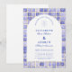 Um design atemporal em azul e branco inspirado no clássico porcelana Delft e padrões de toile francês. A borda de azulejos em patchwork combina flores delicadas, listras e motivos ornamentais que evocam cerâmicas europeias vintage. Um painel arqueado suave no centro mantém o layout refinado e elegante, permitindo que os detalhes do padrão inspirado em porcelana emoldurem a celebração de forma linda. Perfeito para casais que planejam um casamento sofisticado em azul e branco com charme europeu tradicional.