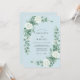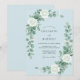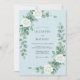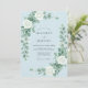 Um design delicado e arejado apresenta flores brancas suaves e folhagens verdes pendentes contra um pano de fundo azul pálido sereno. Esta composição romântica evoca um senso de elegância tranquila. A paleta de cores proeminente é uma mistura de azuis calmantes, brancos cremosos e verdes suaves.