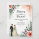 Este elegante convite de casamento floral de aquarela é perfeito para um casamento moderno. A design romântica apresenta uma elegante estrutura floral de aquarela com uma ilustração noiva e noiva e caligrafia preta sobre fundo branco.