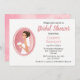 Um chá de panela com ilustração de uma noiva sorridente segurando um buquê de flores em seu vestido de rico e vestindo um véu. Defina dentro um quadro oval cor-de-rosa com uma borda dimensionada.