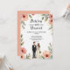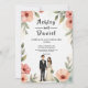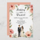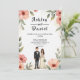 Este elegante convite de casamento floral de aquarela é perfeito para um casamento moderno. A design romântica apresenta uma elegante estrutura floral de aquarela com uma ilustração noiva e noiva e caligrafia preta sobre fundo branco.