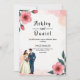 Este elegante convite de casamento floral de aquarela é perfeito para um casamento moderno. A design romântica apresenta uma elegante estrutura floral de aquarela com uma ilustração noiva e noiva e caligrafia preta sobre fundo branco.