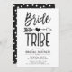 Um convite de café da noiva personalizado para o seu grupo de amigas de confiança. Ele apresenta um visual clássico com tema preto e branco com as palavras noiva tribo escritas em fonte estilo manuscrito. Entre as duas palavras há uma flecha tribal perfurando um coração.