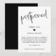 Um anúncio de noivado adiado em preto e branco com design minimalista com "adiado" escrito em uma fonte de caligrafia e seu nome e texto em letras pretas modernas com um pequeno coração preto.