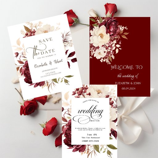 Burgundy elegante e rosas brancas em fundo branco. Um convite bonito que pode ser personalizado com seu nome. Selecione o botão "personalizar" para alterar o estilo, a cor e o tamanho da fonte.