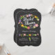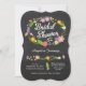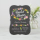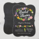 Um convite de casamento boho com uma grinalda floral caprichosa composta por flora colorida da floresta. O fundo de quadro de giz dá a este design um clima descontraído que é perfeito para casamentos ao ar livre.