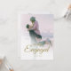 Uma fotografia simples com um moderno roteiro elegante anunciando seu noivado no topo. A foto mudou facilmente para sua própria foto pessoal. O texto no sentido inverso é facilmente alterado para si próprio e está sobre um fundo branco. A foto no verso pode ser trocada por você e também parecerá desbotada.