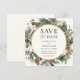 Convite de Noivado Save the Date com tema de Inverno apresenta uma moldura dourada rodeada por sempre-verdes em aquarela, pinheiros e flores de inverno. Personalize com suas informações ou clique em "Clique para personalizar ainda mais" para editar estilos de fonte, tamanho e cores. Itens correspondentes disponíveis na loja Adore Paper Co Zazzle.
