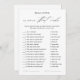 Apresentando o Elegante Name that Cake Chá de panela Game Card - a adição perfeita às suas festividades de chá de panela! Este jogo envolvente terá seus hóspedes zunindo com o entusiasmo enquanto eles tentam combinar pistas com o tipo de bolo descrito. Quer você esteja hospedando um chá de panela, chá de casamento, ou qualquer ocasião especial, este jogo personalizável é um sucesso! Com seu design preto e branco minimalista, o Elegante Nome que o Cartão de Jogo de Chá de panela de Bolo exumenta elegância e sofisticação. Não se limita apenas a chás de panela - também pode ser tocada em chás de fraldas, festas de solteira e até festas de aniversário de crianças. As possibilidades são infinitas! O jogo pode ser jogado individualmente ou em pequenas equipes, acrescentando um elemento de competição amigável ao seu evento. O primeiro jogador ou equipe a combinar todas as respostas corretamente ganha! A sua versatilidade e simplicidade tornam-na adequada para convidados de todas as idades e origens. Feito com cuidado, este cartão de jogo garante uma experiência perfeita e agradável para todos os envolvidos. Seu recurso personalizável permite que você adicione seu próprio toque pessoal, fazer-o realmente único e memorável. Então, por que esperar? Obtenha o Elegante que o Cartão de Jogo de Chá de panela de Bolo hoje e crie momentos inesquecíveis cheios de risos e alegria. Que comecem os jogos de adivinhação!