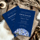Modelo de convite jantado para ensaio de hidrangea azul pálida em azul marinho. O texto branco está impresso, exceto os nomes da noiva e do noivo, que é uma forma manuscrita mais elegante. Inclua os nomes dos hosts no topo como os convidados. Azul escuro sólido ao contrário.