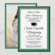 Compartilhe a alegria de um segundo grau ou formandos e convide a família e os amigos a celebrarem com estes anúncios personalizados de convites de festas verde, preto e branco. (DICA DE IMAGEM: Uma maneira fácil de centralizar uma imagem exatamente como você deseja é recortá-la antes de carregá-la no site do Zazzle.) Este modelo formal inclui nomes de pais e formandos, assim como qualquer informação de sua escolha, como detalhes de celebração, honras especiais, título de grau, citação de inspiração favorita, novo endereço de formando, planos educacionais futuros ou posição de emprego. Toda a formulação é simples de personalizar. Design apresenta um fundo branco moderno, boné de conselho de argamassa preta, caligrafia elegante de script, tipografia tradicional e uma foto de sua escolha, como uma foto de mais velho ou imagem da cerimônia de início. Estes cartões de anúncio de graduação são uma maneira moderna e chique de compartilhar sua celebração especial com a família e os amigos. Parabéns ao formando!