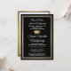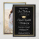 Compartilhe a alegria de um segundo grau ou formandos e convide a família e os amigos a celebrarem com estes anúncios personalizados de convite de festas preto, ouro e branco. (DICA DE IMAGEM: Uma maneira fácil de centralizar uma imagem exatamente como você deseja é recortá-la antes de carregá-la no site do Zazzle.) Este modelo formal inclui nomes de pais e formandos, assim como qualquer informação de sua escolha, como detalhes de celebração, honras especiais, título de grau, citação de inspiração favorita, novo endereço de formando, planos educacionais futuros ou posição de emprego. Toda a formulação é simples de personalizar. Design apresenta um fundo preto moderno, borda falsa de folha de ouro e boné de conselho de argamassa, caligrafia elegante de script branco, tipografia tradicional e uma foto de sua escolha, como uma foto de mais velho ou imagem da cerimônia de início. Observe que o ouro é impresso a cor, não a folha metálica. Estes cartões de anúncio de graduação são uma maneira moderna e chique de compartilhar sua celebração especial com a família e os amigos. Parabéns ao formando!