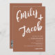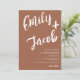 Um convite de casamento moderno, ousado e elegante, com nomes personalizados, com um marcador manual escrito, caligrafia escovada em boho terracotta e branco. Todas as cores de texto, nomes e fundo são personalizáveis. Um convite simples e minimalista. Adicione seu código qr para um tudo em um convite de casamento com rsvp, detalhes e mais informações.