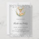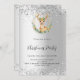 Um fundo elegante de prata. Decorado com uma coroa verde e um veado e um confete. Festa de Natal escrita com um roteiro de estilo muito tenso e moderno. Personalize e adicione as informações de sua parte.