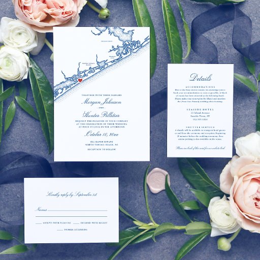 Convite North Topsail Beach Map Elegant Navy Blue Wedding