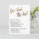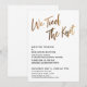 Convide seus convidados para a celebração do seu casamento com a ajuda desses simples cartões de convite. Para o cabeçalho, usei uma fonte manuscrita casual e moderna para criar uma sobreposição de tipografia gráfica que diz "We Tied The Knot". Esta imagem foi adornada com um efeito de folha de ouro falso liso para um resultado festivo. Preencha os espaços em branco do modelo com seus detalhes para personalizar o design. Todas as camadas foram deixadas desbloqueadas para que você também possa clicar para personalizar ainda mais e reposicionar o texto ou até mesmo alterar tamanhos ou fontes. Altere o fundo para qualquer cor que preferir. Alternativamente, você pode optar por adicionar uma imagem ao verso. Por favor, não hesite em entrar em contato para obter ajuda com a personalização.