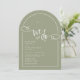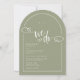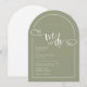 Um convite de casamento elegante e moderno em forma de arco verde que apresenta texto minimalista com um sotaque escrito à mão na frase "nós fazemos" com um simples rabisco cardíaco. Mostrado em um plano de fundo sábio com texto branco e elementos design, mas todos os elementos podem ser recoloridos para corresponder ao seu tema. © Kimbellish, LLC