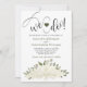 Este convite romântico e elegante apresenta um design floral de cor d'água rústica com um aglomerado de rosas pintados à mão e flores em tons de branco, marfim e creme com folhas de eucalipto folhagem e verde. No topo estão as palavras: "nós fazemos!", escritas em letras modernas com um coração bonito entre elas. A parte de trás do convite é uma cor verde-sábio marmoreada, com um buquê de floração e folhagem amarrada com um arco de cetim.