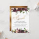 A parte superior e inferior deste convite temático de casamento elegante foram decorados com flores em aquarela em tons de vermelho profundo, burgundy, Marsala, grená, pêssego e rosa rosado. As palavras-chave "nos casamos" foram feitas em uma fonte de letra cursiva moderna e depois decoradas com um efeito de folha de ouro falso. Todo o restante do texto é editável e aparece em uma fonte serifada versátil que você pode alterar se desejar. No verso, coloquei um gráfico ombre com folha de ouro falso. Todas as camadas foram adicionadas separadamente e deixadas desbloqueadas para lhe dar o máximo controle de design; edite esta aparência tanto quanto precisar e não hesite em entrar em contato comigo se precisar de ajuda com o processo. // 56 //
