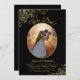 Este convite de recepção de casamento ou festa de depois apresenta um título elegante em caligrafia que diz "Nós Fizemos!". Possui um design simples, porém elegante, com letras douradas em uma fonte sofisticada sobre um fundo preto clássico, e sua foto em uma moldura oval rodeada por espirais e volutas ornamentais douradas em fólio falso. Perfeito para casamentos secretos ou celebrações que acontecem após uma cerimônia privada. Uma ótima maneira de convidar sua família e amigos para celebrar seu amor.