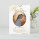 Este convite de recepção de casamento ou festa de depois apresenta um título elegante em letra cursiva que diz "Nós Fizemos!". Tem um design simples, porém elegante, com letras douradas sofisticadas em um fundo branco clássico, e sua foto em uma moldura oval rodeada por espirais e floreios ornamentados em folha falsa dourada. Perfeito para casamentos secretos ou celebrações que acontecem após uma cerimônia privada. Uma ótima maneira de convidar familiares e amigos para celebrar seu amor.