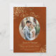Este convite de recepção de casamento ou festa após o casamento apresenta um título elegante em letra cursiva que diz "Nós Fizemos!". Possui um design simples, porém elegante, com letras douradas em escrita cursiva sobre um fundo de cor laranja enferrujado marmorizado ou umber queimado, e sua foto em uma moldura oval rodeada por babados de renda em folha falsa. Perfeito para casamentos secretos ou celebrações que acontecem após uma cerimônia privada. Uma ótima maneira de convidar sua família e amigos para celebrar seu amor.