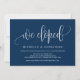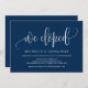 Este cartão de convite com design de caligrafia moderna (nós fugimos) é perfeito para a celebração / anúncio de fuga de casamento. Adicione seus detalhes na fonte / letra azul-marinho correspondente.