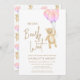 Este encantador convite de chá de fraldas da menina apresenta balões cor-de-água rosa e um ursinho de pelúcia com as palavras "Nós podemos esperar mais cedo" na tipografia do na moda. É facilmente personalizável. Original Watercolor © Michele Davies.