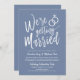 Depois do grande dia e da troca de alianças, convide seus convidados mais honrados para uma celebração após o casamento. Este convite apresenta as palavras "Nós estamos nos casando" em letras cursivas elegantes sobre um fundo na cor Azul Pombo. Ao lado disso, há um par de alianças de casamento. Abaixo deste gráfico exclusivo há um espaço para suas próprias palavras e informações para o seu evento pós-casamento.