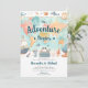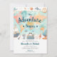 Um convite de chá de fraldas de menino giro, neutro em relação ao gênero, com um tema de viagem e aventura, com uma ilustração aquarela do mapa mundial com personagens bonitos e elementos relacionados a viagem, com o título "Nossa Aventura Começa". Perfeito para futuros pais que amam viagem, que adoram o tema da aventura para um chá de fraldas.