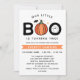 Convite de aniversário de Halloween para uma criança com Our Little Boo escrito no topo com uma abóbora substituindo um O e um fantasma dançando no outro. Acima voa um morcego entre as estrelas sobre fundo branco.