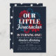 Celebrar com isso, nosso pirata está virando um Convite de festas de primeiro aniversario! Este encantador convite foi feito para celebrar o primeiro aniversário de uma criança com um tema festivo e patriótico. A frase "O nosso Pequeno Firecracker" contra uma ilustração de fogos de artifício vermelhos e azuis sobre fundo de marinho acrescenta um toque lúdico e carinhoso, simbolizando a personalidade enérgica e vibrante da criança.