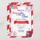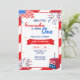Convide seus amigos e família para a primeira festa de aniversário do seu filho com o Nosso Pequeno Firecracker está virando um convite de aniversário, projetado por Designs Twin Spirit. O convite apresenta fogos de artifício vermelhos, brancos e azuis, um bolo, a bandeira americana, estrelas brancas e douradas, e texto azul e vermelho.