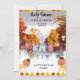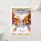 Uma ilustração do outono de um vasto fundo branco de neve com as silhuetas de montanhas e árvores à distância. As montanhas e árvores se esticam muito no horizonte, criando uma atmosfera serena e tranquila. O chão está coberto de laranja e folhas amarelas vibrantes, adicionando um pop de cor à cena.