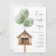 Tema do chá de fraldas "Um novo capítulo" com ilustração de uma biblioteca de empréstimos da mini vizinhança com balões verdes e um fundo branco.