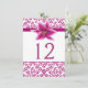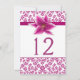 Cartão de número de mesa de recepção de casamento elegante feito em um padrão de damasco floral rosa violeta e branco. Gráficos de uma fita de cetim rosa violeta e uma bela flor de lírio stargazer decoram a parte superior da área de texto branca. Personalize o número roxo para cada mesa na sua recepção.
