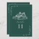 Ilustração de celeiro rústico no topo com borda botânica de arte de linha. O fundo é a cor esmeralda.