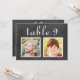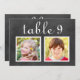 Os modernos e únicos cartões personalizados de números das mesas de casamento apresentam fotos de infância da noiva e do noivo numa idade que corresponde ao número da tabela. Para personalizar: digite o número da tabela, clique em "alterar" pelas fotos padrão para carregar suas próprias fotos digitais ou digitalizadas e adicione esse cartão de número de tabela individual ao seu carrinho de compro. Repita para todos os números de tabela necessários. Texto personalizado de script branco em um fundo texturizado de quadro negro rústico.