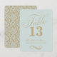 Cartão de caligrafia azul turquesa pastel e dourado chique e elegante com um monograma floreado e detalhes de design de pergaminho, incluindo um belo padrão damasco no verso do cartão.