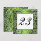 Um tecido verde brilhante e profundo é sobreposto em um padrão elegante de renda branca paisley para um cartão de número de mesa de recepção de casamento ou festa que é elegante e único.