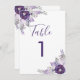 Este cartão de número de mesa tem flores de aquarela roxa clara e escura, folhas e elementos florais prateados. O texto é totalmente editável. Você também pode alterar a fonte. Este cartão tem convites, envelopes, etiquetas e selos correspondentes. Faça com que todos os itens do seu casamento sejam coordenados!