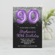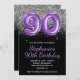 Crie o seu aniversário moderno de 90 com a arte digital do número de balão de folha falsa. Envie uma mensagem ao criador se precisar de um convite para uma idade diferente criada. O fundo de vidro feminino apresenta gráficos decorativos faux brilhantes prateados sobre uma cor preta sólida. O brilho luxuoso, o brilho e os efeitos de texto em folha são criados por elementos artísticos que impressão gostam de uma foto. Você pode personalizar a caligrafia branca e os estilos modernos de fonte de todos os bonés e a cor púrpura branca ou pálida.