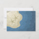 Um cartão de número de assento de mesa com tema de praia e oceano, apresentando uma costa arenosa com estrelas-do-mar. Ondas azuis do oceano... Personalize adicionando diferentes números de mesa conforme desejado.