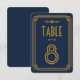 Estes números de mesa apresentam uma paleta de cores azul e dourada, uma moldura geométrica e outros detalhes estilísticos, todos inspirados no Art Déco e nos loucos anos 20. Você pode personalizar os campos de texto de amostra ao seu gosto.