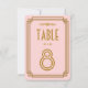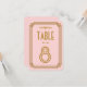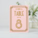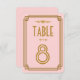 Números de mesa com uma paleta de cores rosa e dourada, uma moldura geométrica e outros detalhes estilísticos, todos inspirados no Art Déco e nos loucos anos vinte. Você pode personalizar os campos de texto de amostra ao seu gosto.