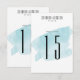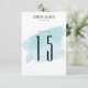Um número de mesa de casamento moderno apresenta um fundo de lavagem de aquarela turquesa.